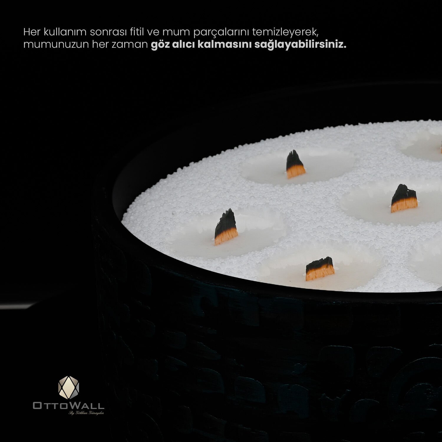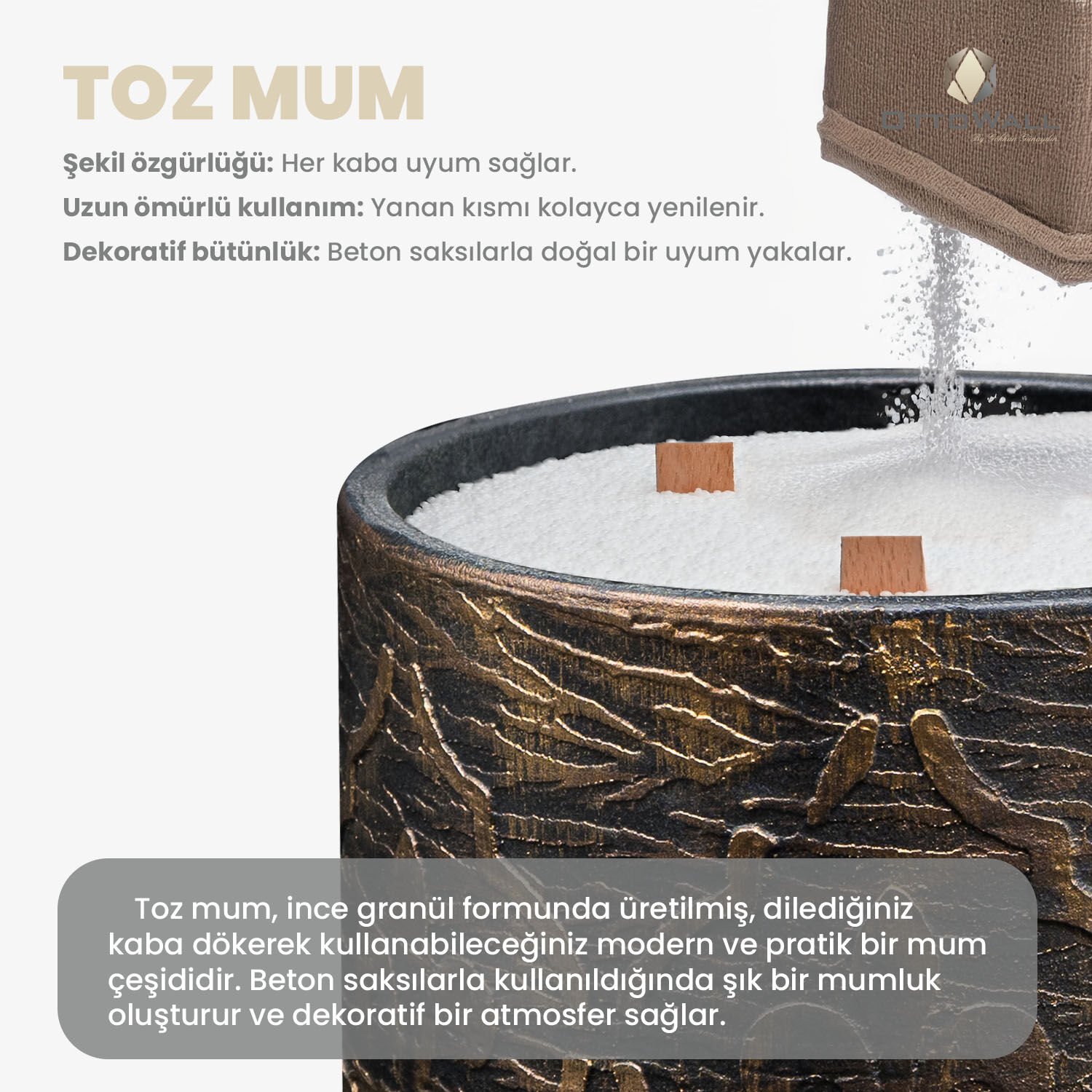 Şık beton kab içinde sunulan bu toz mum seti, hem dekoratif hem de pratik bir kullanım sağlar. Minimalist tasarımıyla evinize estetik bir dokunuş katar.