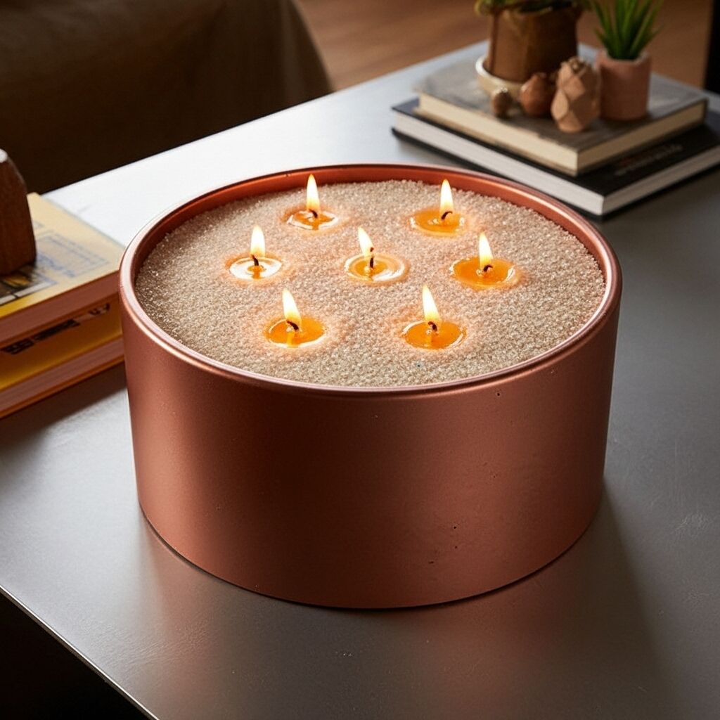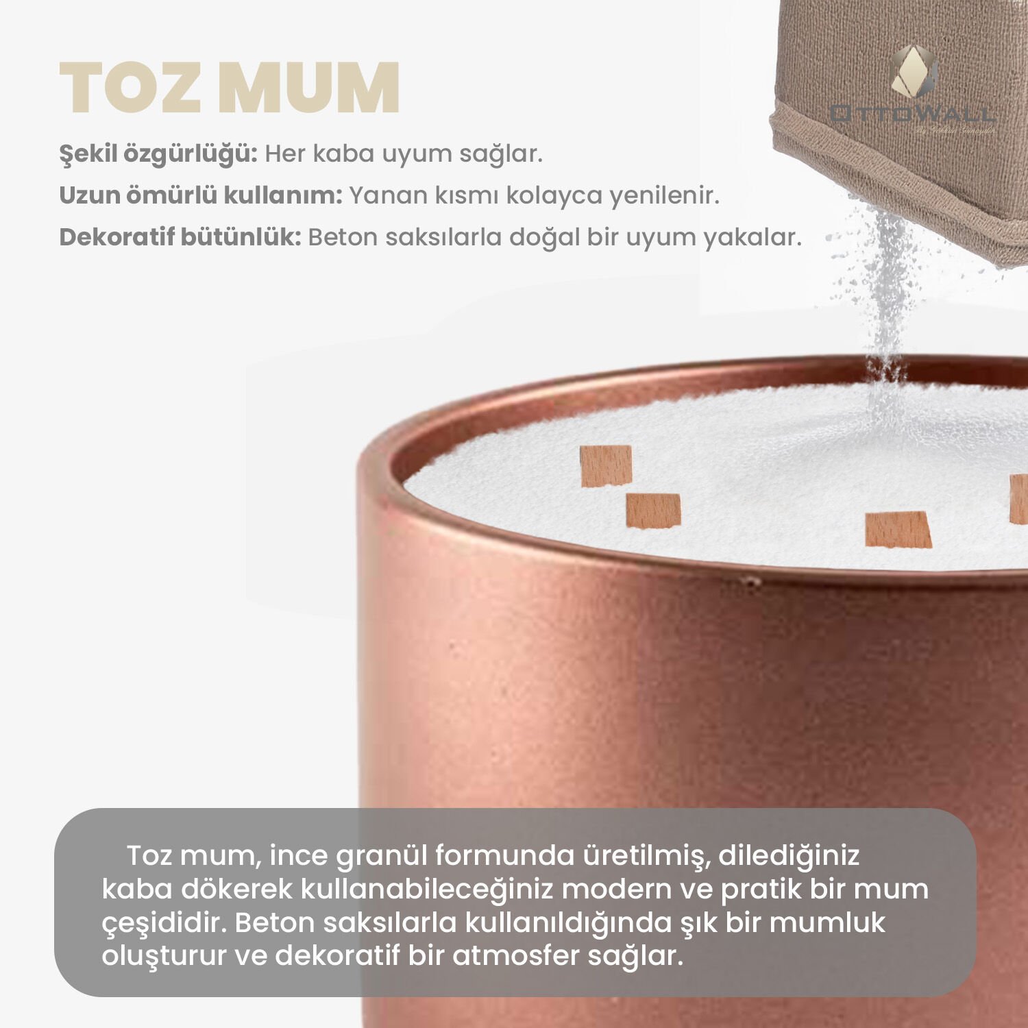 Şık beton kab içinde sunulan bu toz mum seti, hem dekoratif hem de pratik bir kullanım sağlar. Minimalist tasarımıyla evinize estetik bir dokunuş katar.