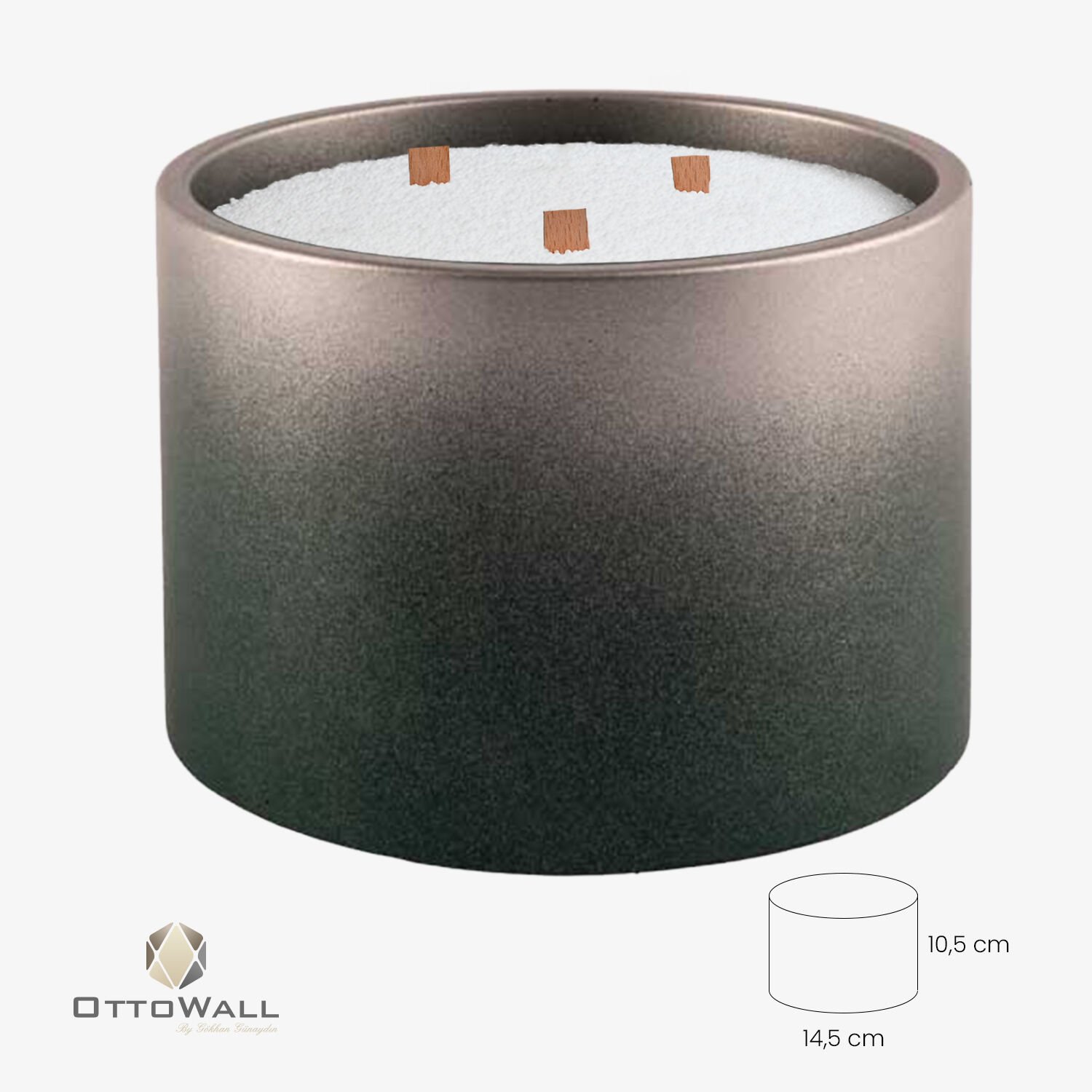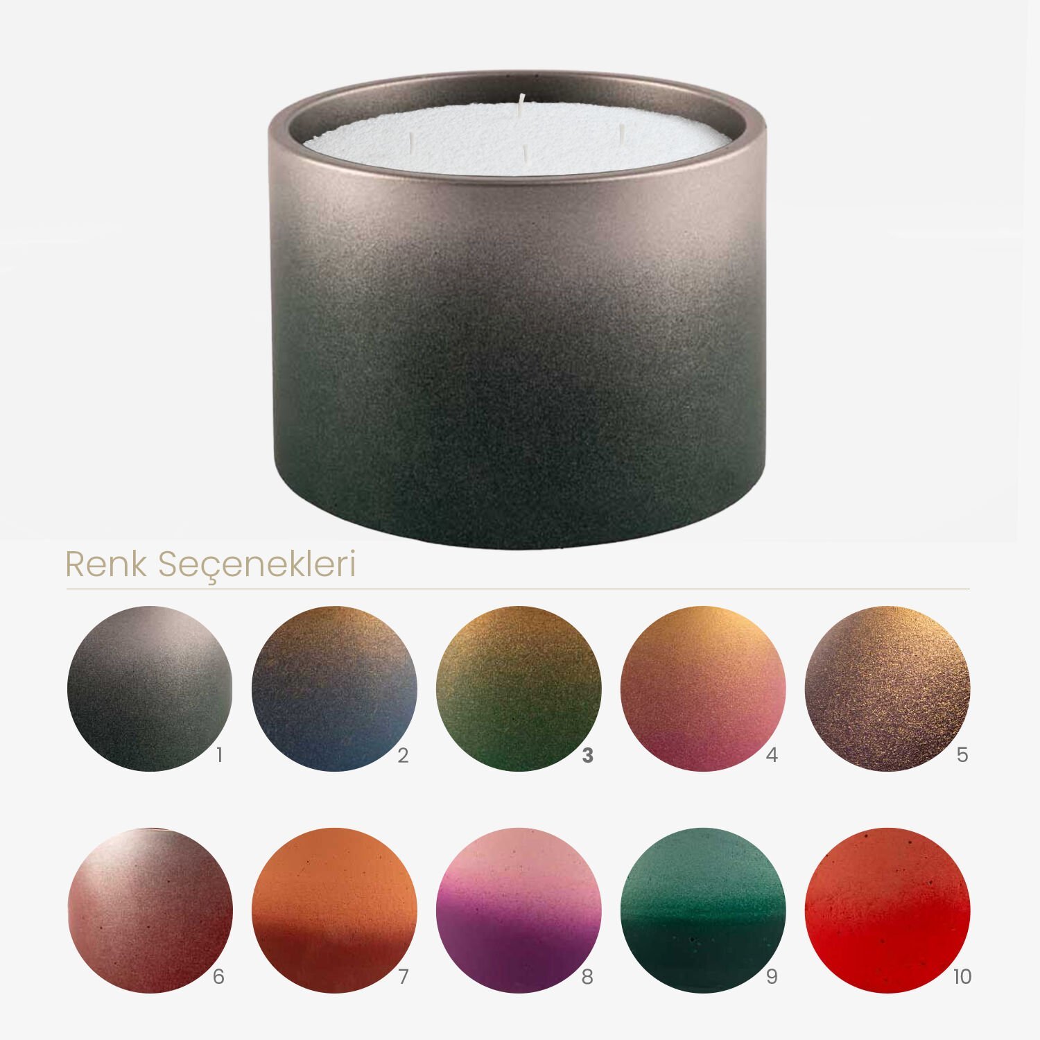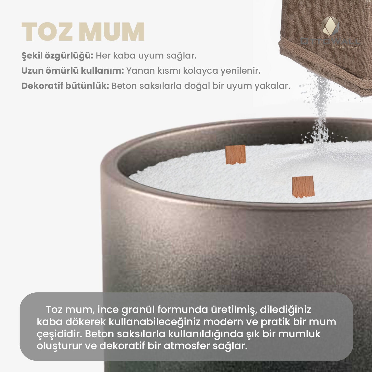 Şık beton kab içinde sunulan bu toz mum seti, hem dekoratif hem de pratik bir kullanım sağlar. Minimalist tasarımıyla evinize estetik bir dokunuş katar.