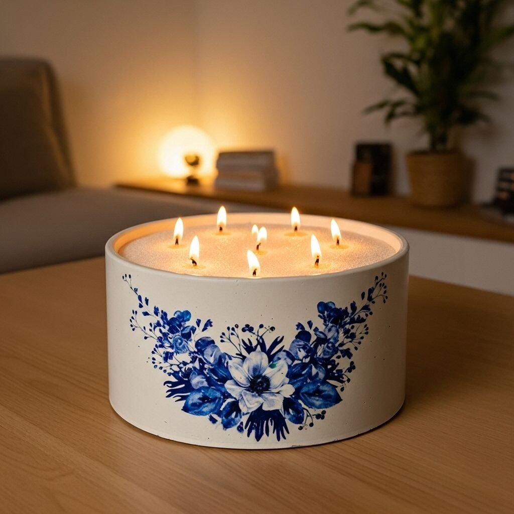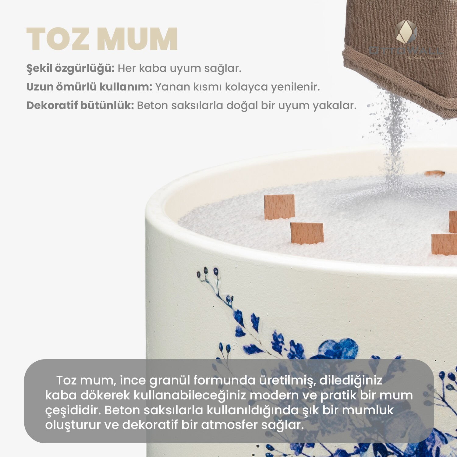 Şık beton kab içinde sunulan bu toz mum seti, hem dekoratif hem de pratik bir kullanım sağlar. Minimalist tasarımıyla evinize estetik bir dokunuş katar.