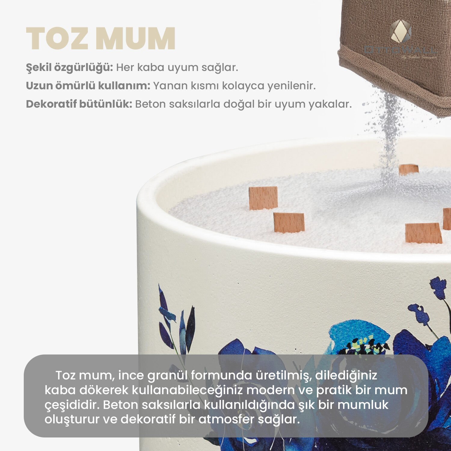 Şık beton kab içinde sunulan bu toz mum seti, hem dekoratif hem de pratik bir kullanım sağlar. Minimalist tasarımıyla evinize estetik bir dokunuş katar.