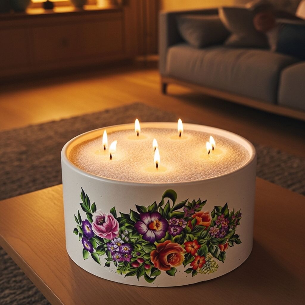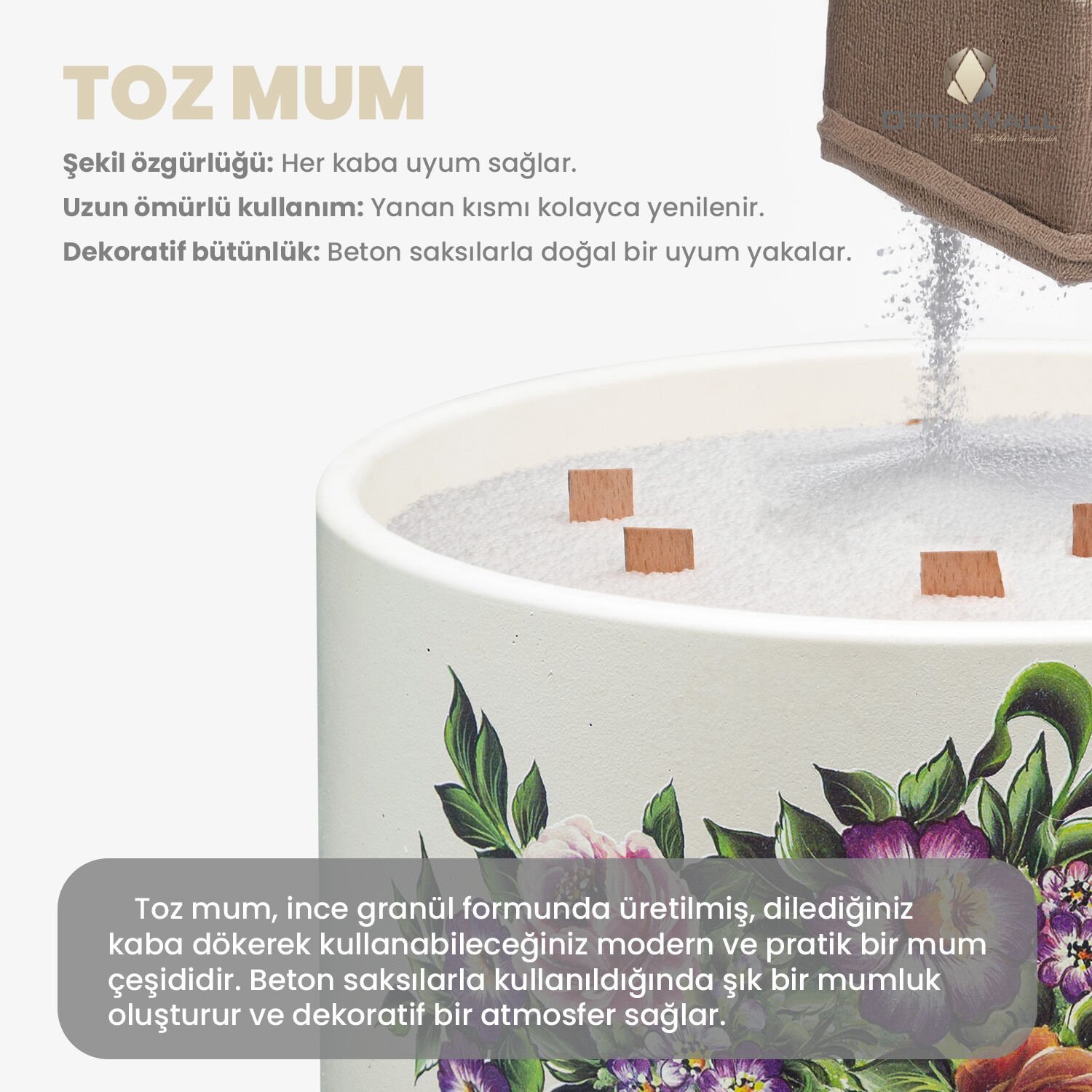 Şık beton kab içinde sunulan bu toz mum seti, hem dekoratif hem de pratik bir kullanım sağlar. Minimalist tasarımıyla evinize estetik bir dokunuş katar.