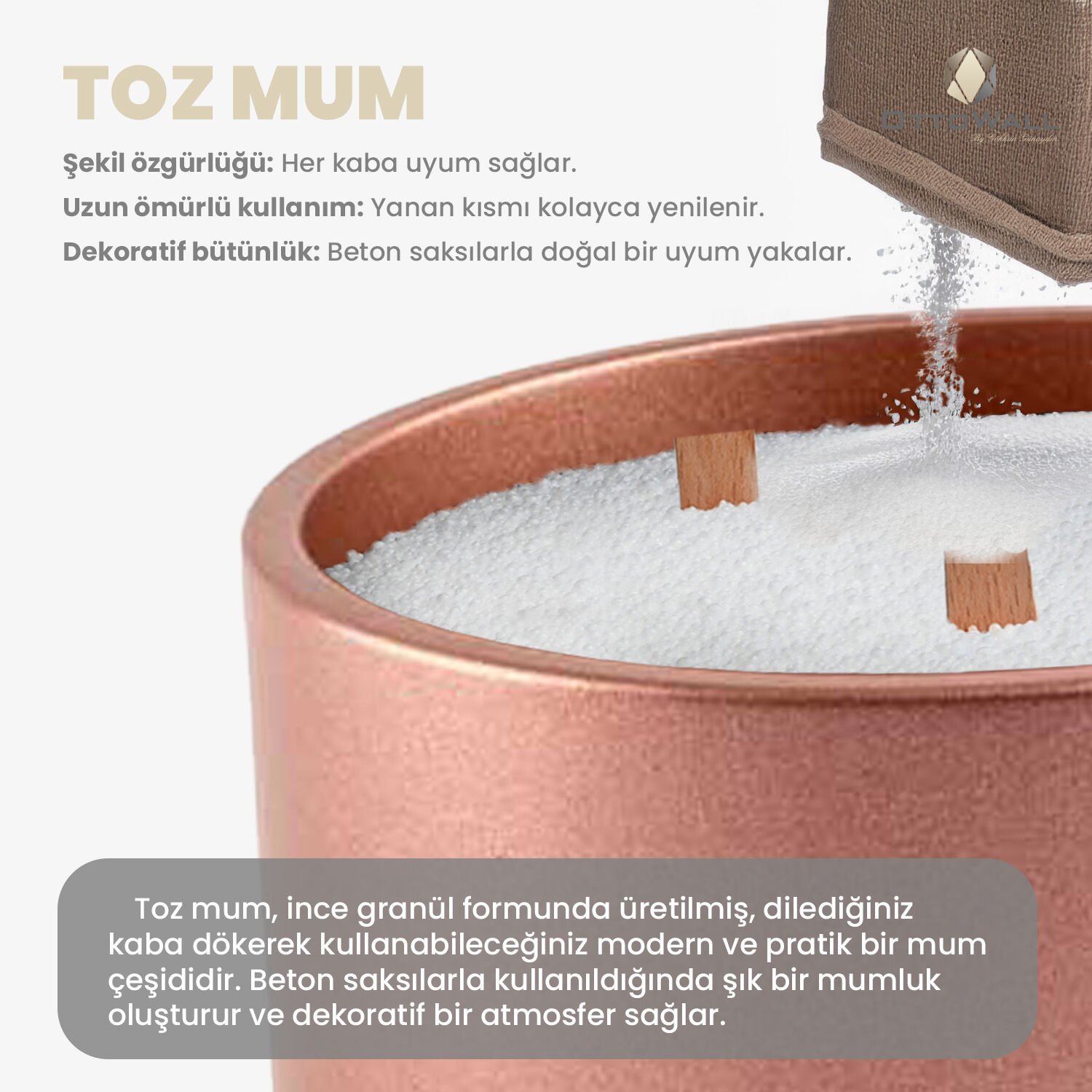 Şık beton kab içinde sunulan bu toz mum seti, hem dekoratif hem de pratik bir kullanım sağlar. Minimalist tasarımıyla evinize estetik bir dokunuş katar.