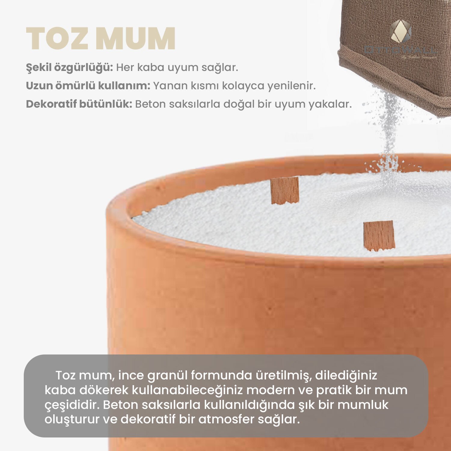 Şık beton kab içinde sunulan bu toz mum seti, hem dekoratif hem de pratik bir kullanım sağlar. Minimalist tasarımıyla evinize estetik bir dokunuş katar.