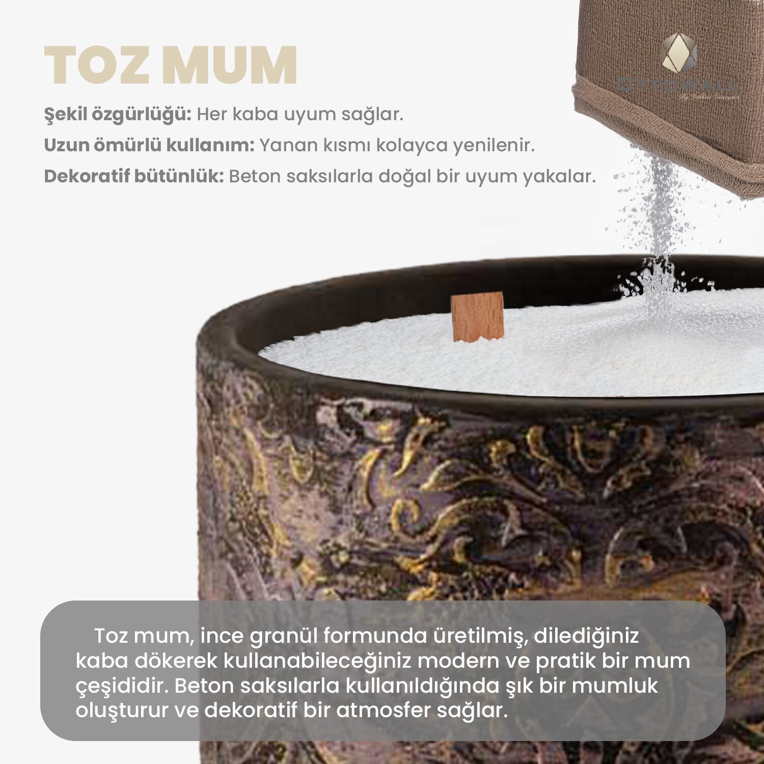 Şık beton kab içinde sunulan bu toz mum seti, hem dekoratif hem de pratik bir kullanım sağlar. Minimalist tasarımıyla evinize estetik bir dokunuş katar.