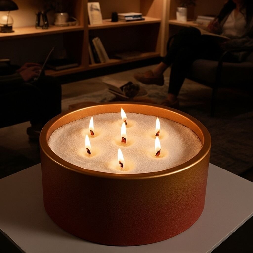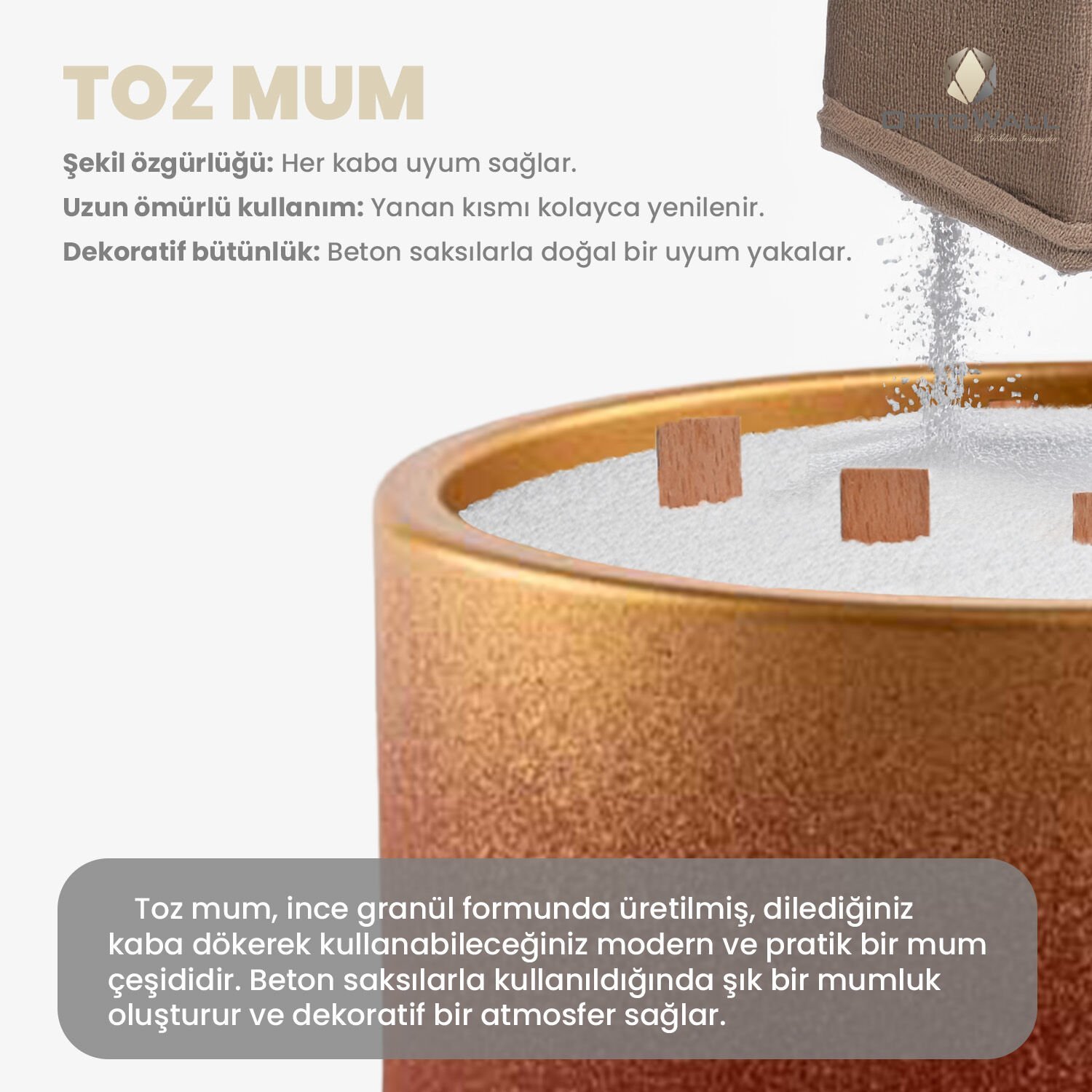 Şık beton kab içinde sunulan bu toz mum seti, hem dekoratif hem de pratik bir kullanım sağlar. Minimalist tasarımıyla evinize estetik bir dokunuş katar.