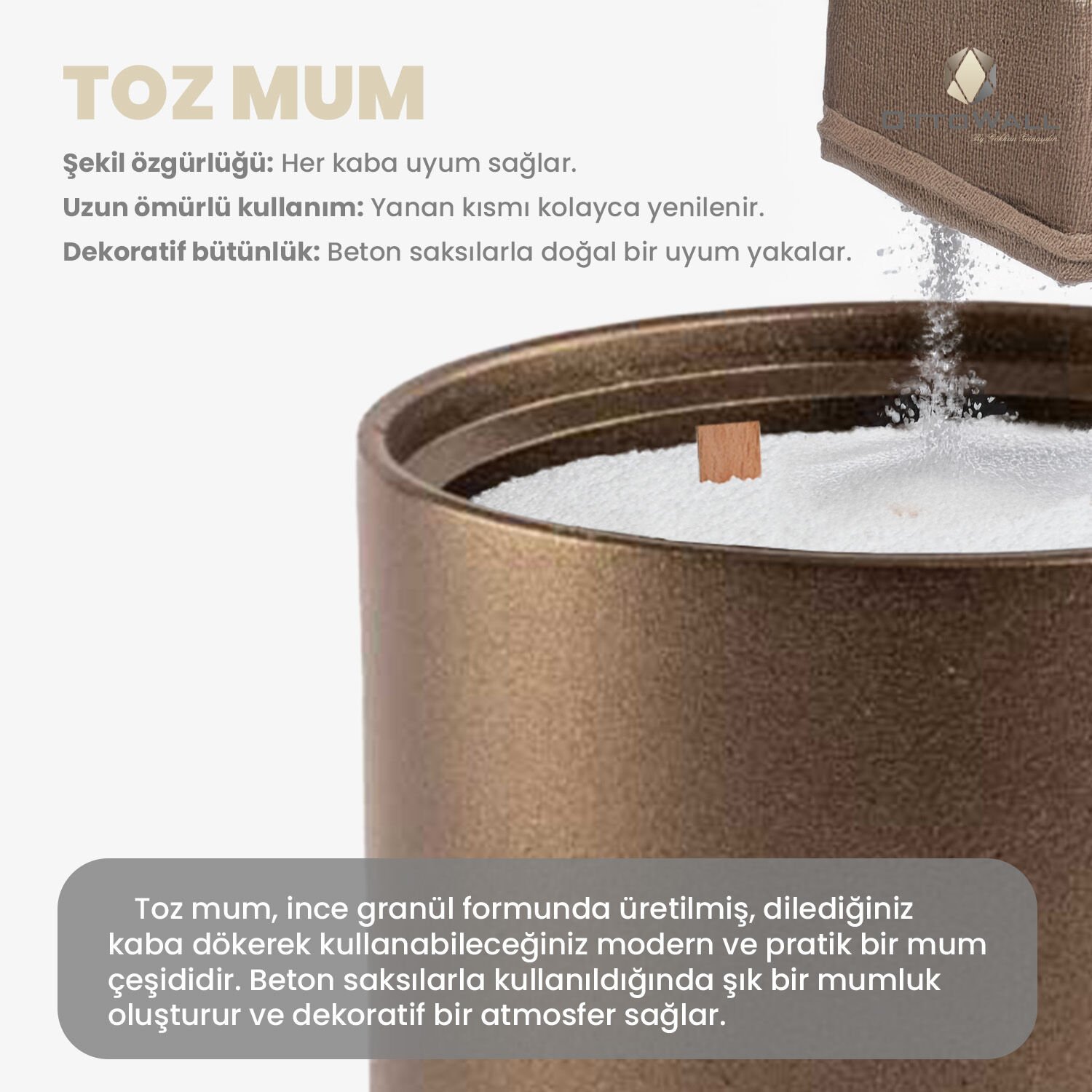 Şık beton kab içinde sunulan bu toz mum seti, hem dekoratif hem de pratik bir kullanım sağlar. Minimalist tasarımıyla evinize estetik bir dokunuş katar.