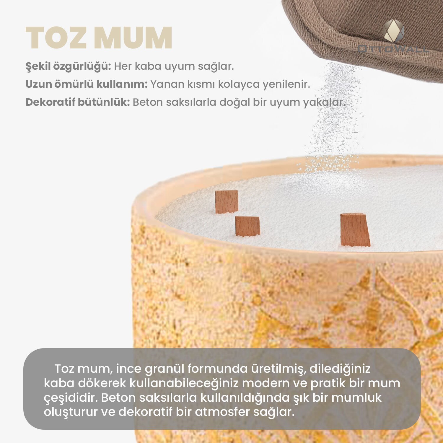 Şık beton kab içinde sunulan bu toz mum seti, hem dekoratif hem de pratik bir kullanım sağlar. Minimalist tasarımıyla evinize estetik bir dokunuş katar.