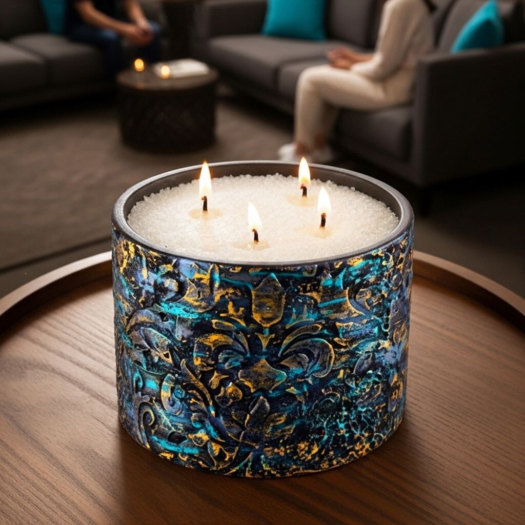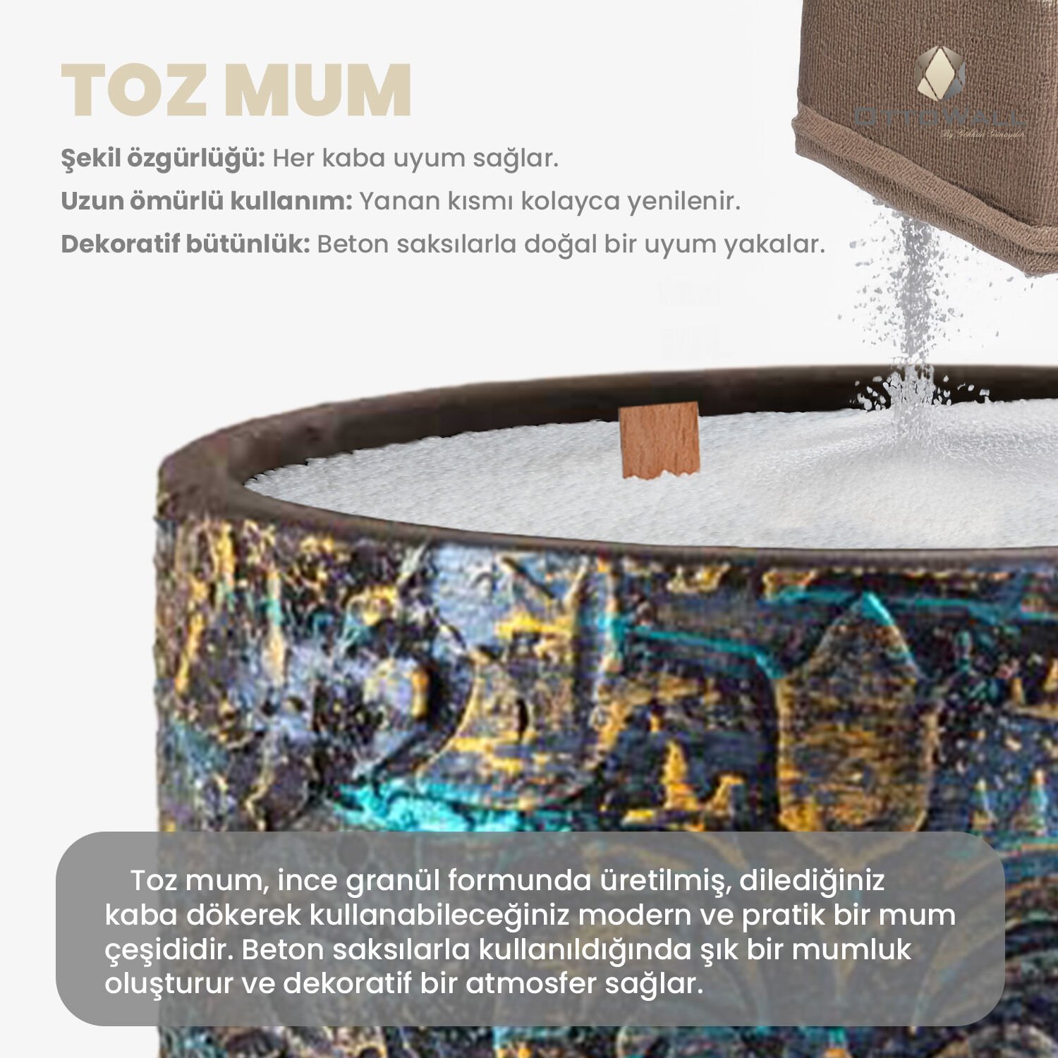 Şık beton kab içinde sunulan bu toz mum seti, hem dekoratif hem de pratik bir kullanım sağlar. Minimalist tasarımıyla evinize estetik bir dokunuş katar.