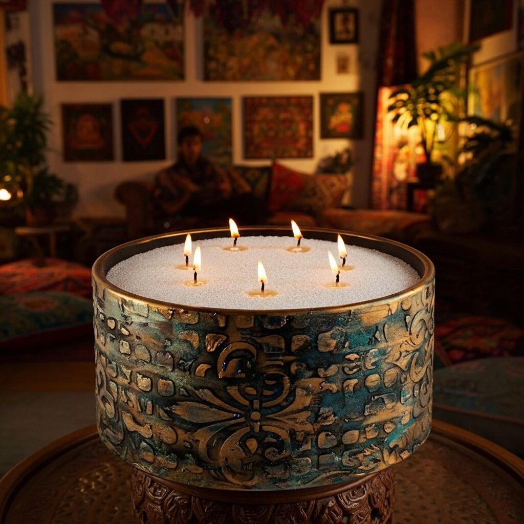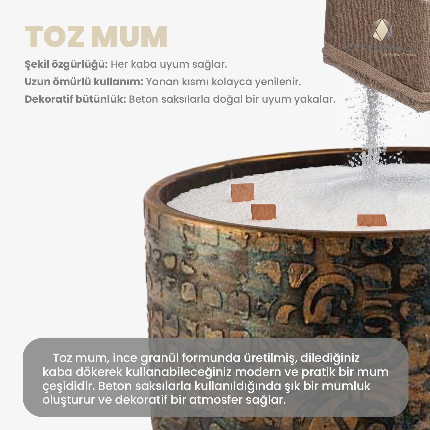 Şık beton kab içinde sunulan bu toz mum seti, hem dekoratif hem de pratik bir kullanım sağlar. Minimalist tasarımıyla evinize estetik bir dokunuş katar.