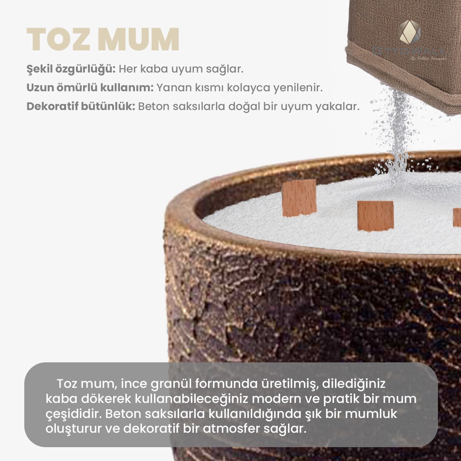 Şık beton kab içinde sunulan bu toz mum seti, hem dekoratif hem de pratik bir kullanım sağlar. Minimalist tasarımıyla evinize estetik bir dokunuş katar.